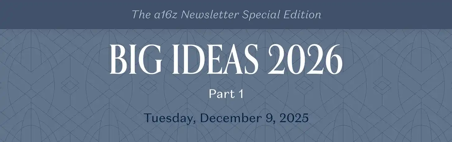 a16z의 4개 투자팀은 연례 보고서인 "Big Ideas 2026"에서 인프라, 성장, 헬스케어, 인터랙티브 월드라는 네 가지 측면에서 2026년의 주요 전망에 대한 통찰력을 제공했습니다.