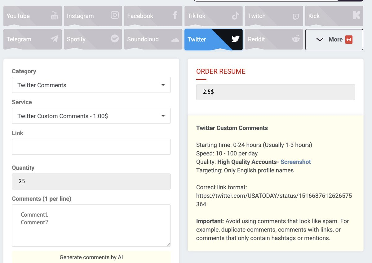Given that the 34 high-risk accounts in the OpenAi report above are all bot accounts, which should be "services" that can be purchased on the marketplace, we screened out 7 eligible SMM (Social Media Marketing) platforms based on criteria (custom comments, services using digital currency for payment, etc.).