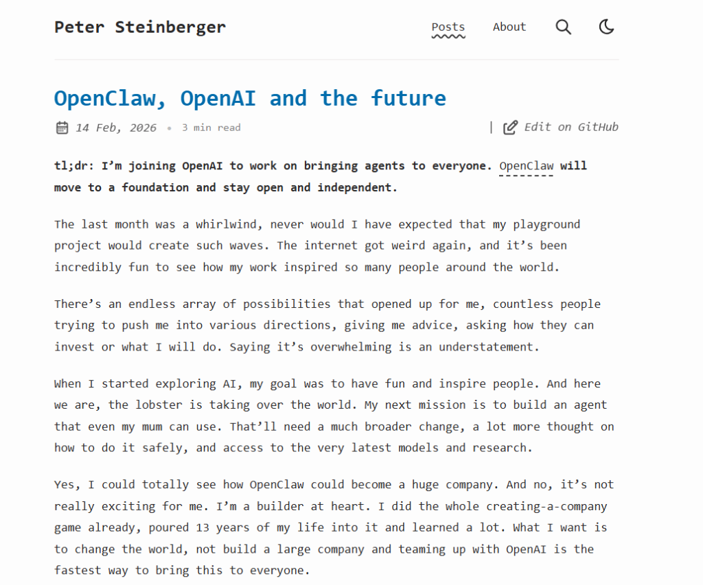 Steinberger stated frankly: "Ultimately, I feel that OpenAI is the best place to continue advancing my vision and expanding its impact."