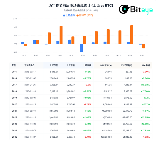 Data as of February 14, 2026 UTC (based on CoinGecko BTC daily OHLC data and Shanghai Stock Exchange announcements) Statistical criteria: The closing price of the last trading day before the Spring Festival to the closing price of the first trading day after the holiday (approximately 7-8 calendar days, excluding weekend closures) will be used to ensure complete alignment between the A-share and BTC time windows.Key observations: