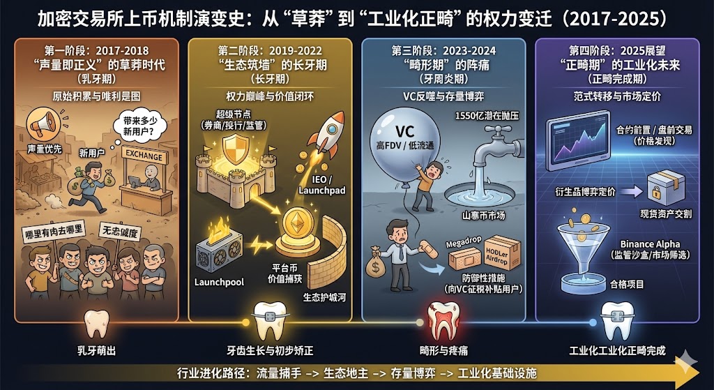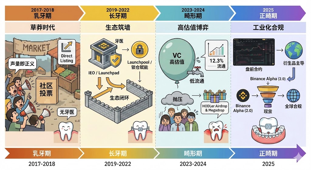 It demonstrates how exchange players, represented by Binance, have adjusted their positioning in different cycles: from the initial "traffic hunter" to the "ecosystem landlord", and after encountering the crisis of "VC harvesting", they finally chose to evolve into "industrialized financial infrastructure".
