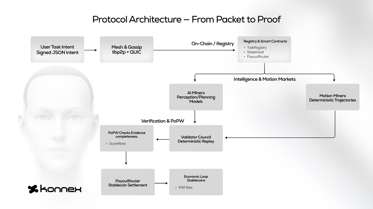 Konnex 通过一个确定性的多层协议栈,将任务广播、竞价、执行、验证与结算完整地搬到链上:底层是去中心化通信网络,中层是机器人身份、任务托管与双重质押的智能合约系统,上层是可插拔的 AI 与运动能力市场,最终由验证者通过 PoPW(Proof of Physical Work,物理工作证明)进行确定性重放与审计,实现稳定币原子结算。稳定币负责真实价值流转,KNX 负责安全、治理与惩罚,形成一个可持续的机器人链上工作闭环。