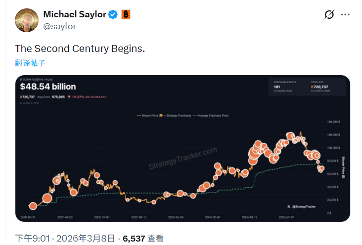 PANews reported on March 8 that Strategy founder Michael Saylor once again posted information related to Bitcoin Trackers, writing, "The Second Century Begins." Based on past patterns, Strategy always discloses information about increasing its Bitcoin holdings the day after such news is released.