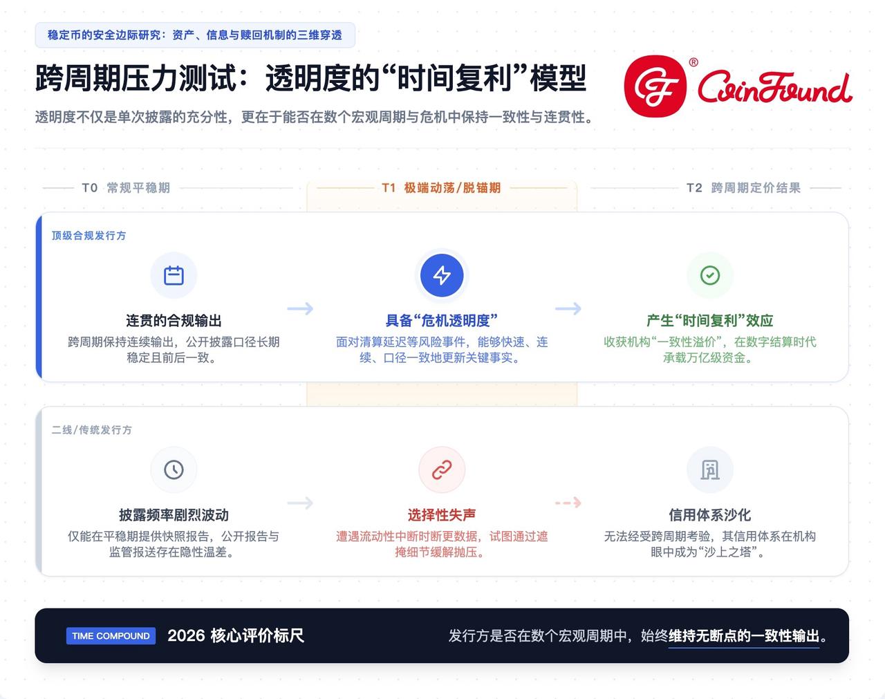 在完成了对资产明细与实时验证的穿透后,专业投资者必须评估的最后一个维度是信息披露的“一致性溢价”以及 2026 年特有的“监管信息差” 。透明度的价值并不只体现在单次披露是否充分,更体现在其能否跨周期保持连续、可比和稳定 。一个稳定币发行方即便能在当下提供一份详尽的审计报告,如果其在长达数年的周期中披露频率波动剧烈,或者在市场动荡期出现“选择性失声”,其建立的信用体系在机构投资者眼中依然是沙上之塔 。2026 年,衡量透明度的最高标准不仅是“披露了什么”,而是发行方是否在数个宏观周期中,始终维持了无断点、跨管辖区的一致性输出,从而产生透明度的“时间复利”效应 。