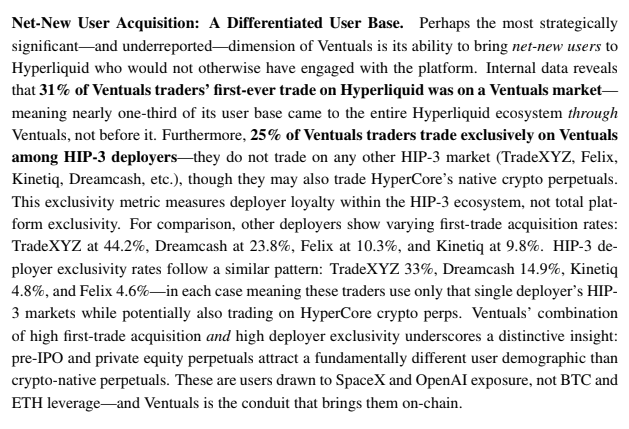 31% of Ventures users made their first on-chain transaction in the Ventures marketplace, and nearly a third entered the Hyperliquid ecosystem because of the Pre-IPO Perp. 25% of users only trade in Ventures and don't use any other HIP-3 Deployer. This precisely confirms what we said earlier: RWA is actually attracting a distinct user base.