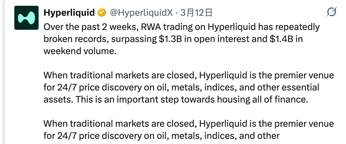 Because it was the weekend, traditional global markets were closed, but @HyperliquidX was open, and a large number of users flocked to on-chain trading of crude oil for the first time. On March 2nd, when commodity markets reopened, Brent crude oil jumped, and RWA trading volume on Hyperliquid saw its first peak.