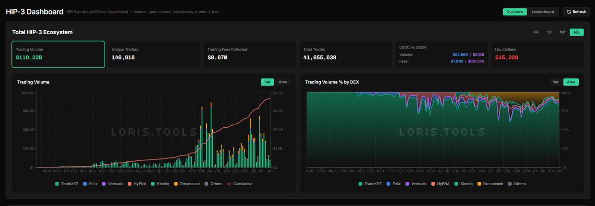 While there is significant overlap in the assets deployed by these Deployers, interestingly, this doesn't seem to be involution, but rather more of a brokerage logic: each Deployer has its own front-end, its own user community, and its own customer acquisition channels. Their users may not necessarily be aware of other Deployers, nor do they necessarily trade on Hyperliquid's main site's mixed UI. Data proves this point: