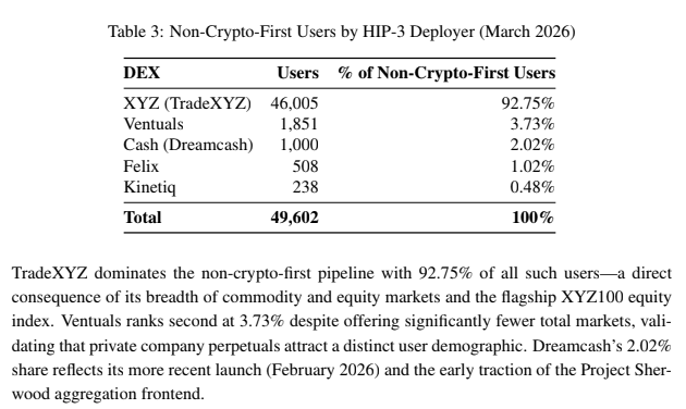 A Hyperliquid research report released yesterday by @smartestxyz revealed a phenomenon that most people have overlooked: these HIP-3 marketplaces are not just serving Crypto users, they may be bringing people who have never been exposed to Crypto onto the blockchain.