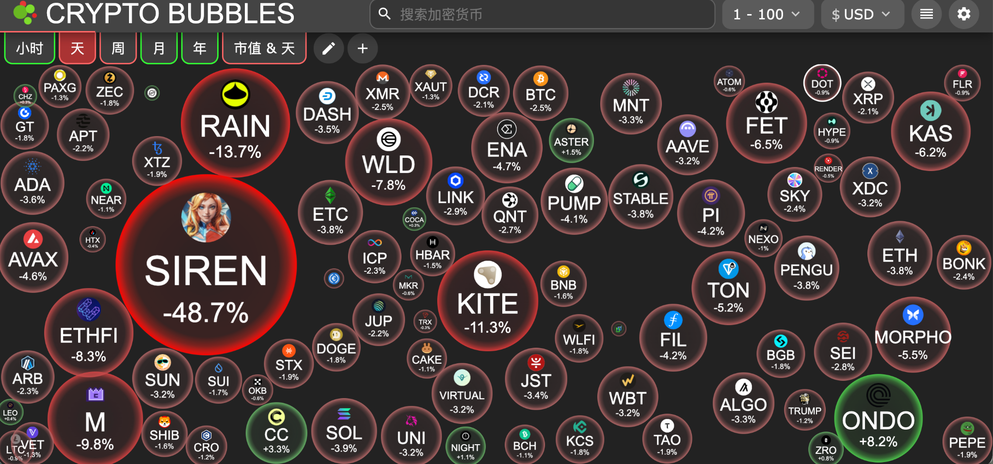 The biggest drops among the top 100 cryptocurrencies by market capitalization today were: Siren down 48.7%, Bittensor down 13.7%, Stellar down 11.3%, ASI Alliance down 9.8%, and Quant down 8.3%.