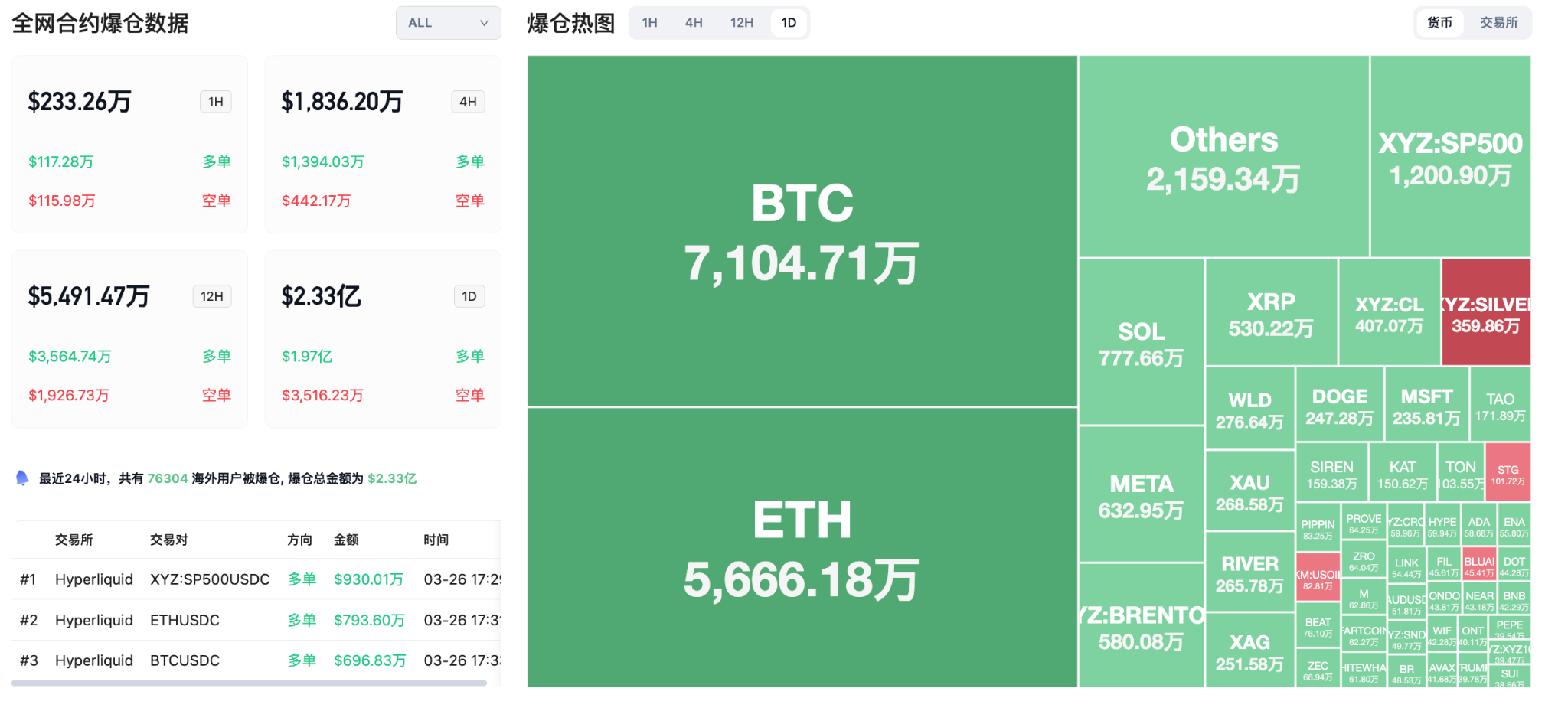 24-hour liquidation data: A total of 76,304 people worldwide were liquidated, with a total liquidation amount of $233 million, including $71.04 million in BTC liquidations, $56.66 million in ETH liquidations, and $7.77 million in SOL liquidations.