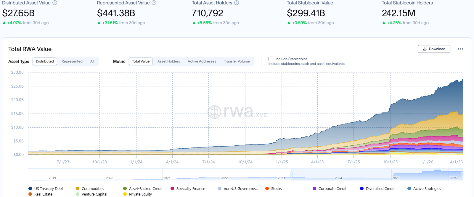 According to the latest data disclosed by RWA.xyz, as of April 3, 2026, the total market capitalization of RWA on-chain has risen to $27.65 billion, maintaining steady growth, up 4.07% month-over-month. The total number of asset holders has increased to approximately 710,800, up 5.56% month-over-month, matching the asset growth rate.