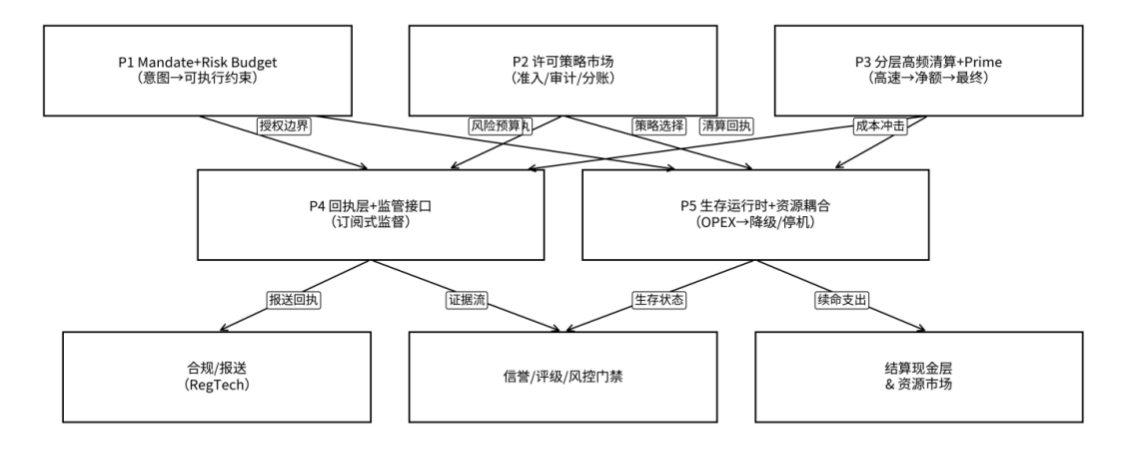 下图展示了五个制度原语之间的依赖关系:P1、P2、P3 作为上游制度地基,共同支撑 P4(回执层)与 P5(生存运行时);而 P4 与 P5 进一步把信息、约束与成本冲击传递给合规、信誉风控门禁、结算现金层与资源市场。