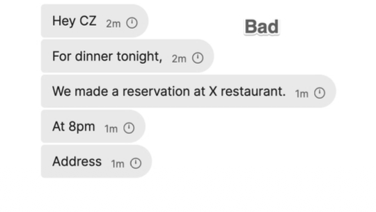 One message, done. Yes, I try to optimize my time this way. I don't like talking to people with "bad communication habits." They have more time; I don't.