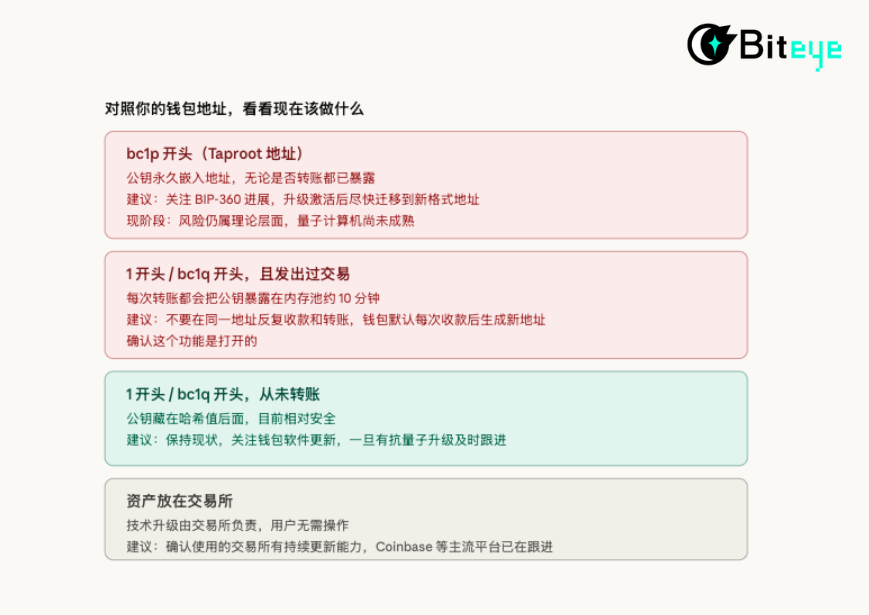 Open your wallet and check the beginning of the receiving address. Addresses starting with "bc1p" are Taproot addresses, where the public key is embedded within the address itself by default, representing a high-risk format with long-term exposure. If your assets are held in such addresses and have never been touched, the risk is currently theoretical, but it's worth paying attention to the progress of BIP-360.