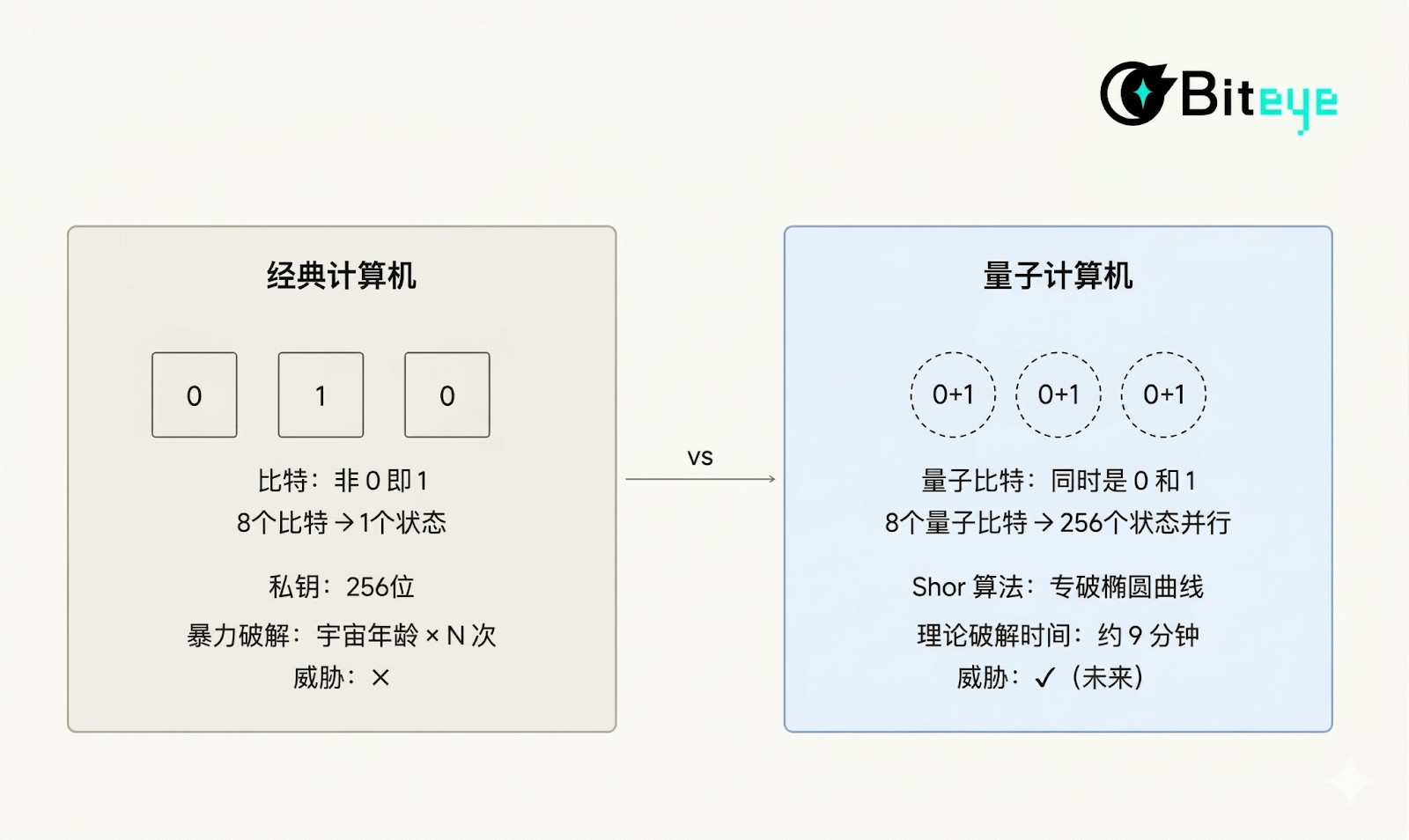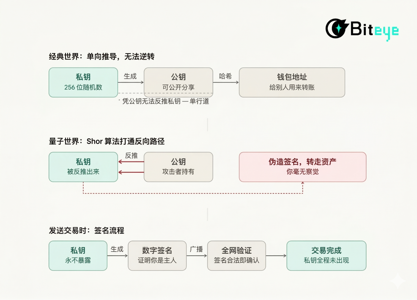However, parallel processing alone is not enough to pose a threat to Bitcoin. What truly makes quantum computers a threat to cryptography is "Shor's algorithm," invented in 1994 by MIT mathematician Peter Shor. This algorithm is specifically designed to factor large integers and solve the elliptic curve discrete logarithm problem, which are precisely the foundation of the security of Bitcoin and Ethereum private keys.