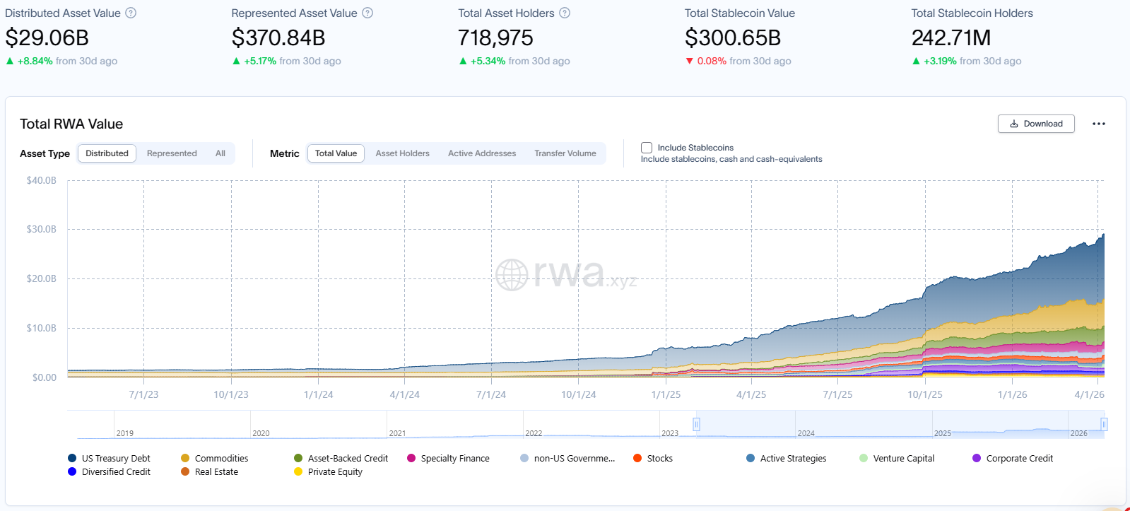 According to the latest data disclosed by RWA.xyz, as of April 10, 2026, the total market capitalization of RWA on-chain has risen to $29.06 billion, an increase of 8.84% compared to the same period last month, maintaining growth for several consecutive months and becoming the main engine of its expansion. The total number of asset holders has increased to approximately 718,900, an increase of 5.34% compared to the same period last month, matching the asset growth rate.