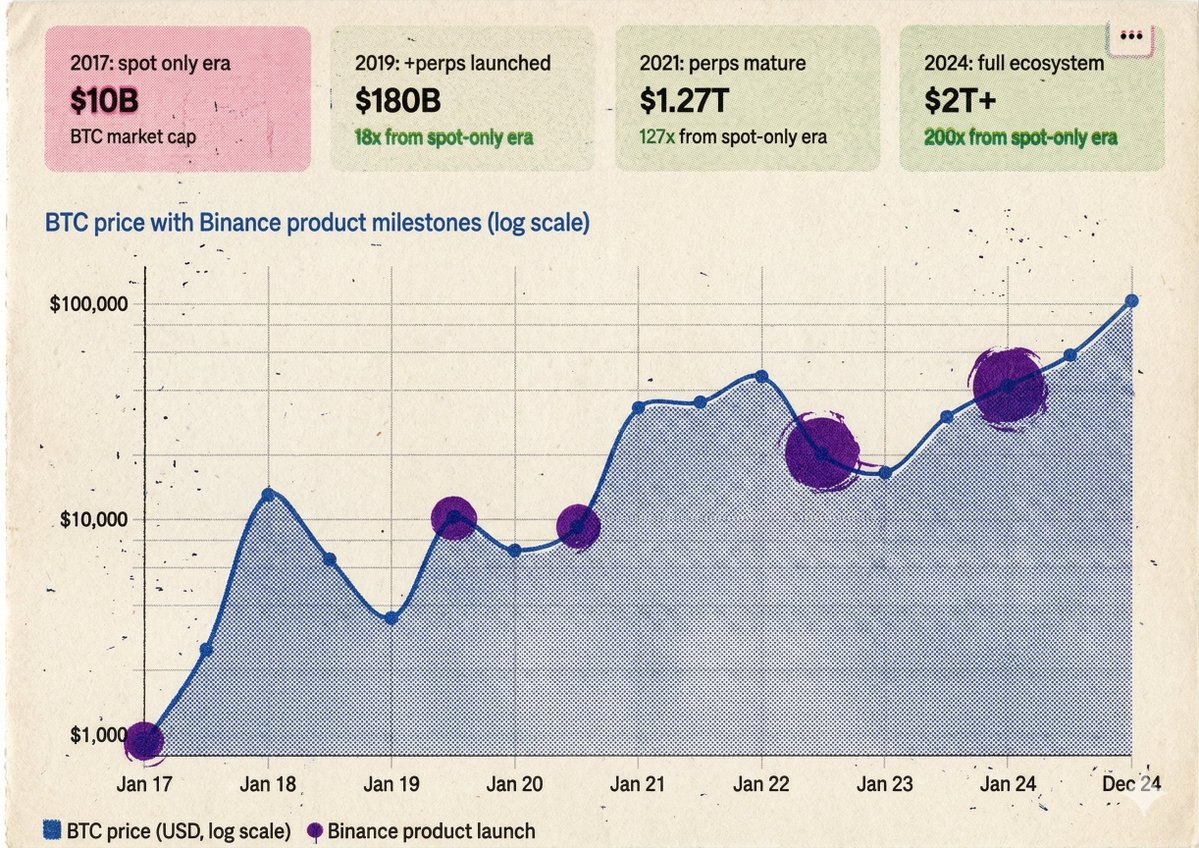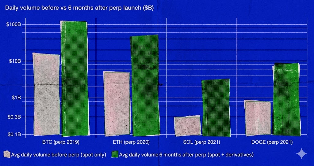 The pattern continued: BTC got perps and had its biggest bull market. ETH too. SOL too. Every altcoin that got a perp experienced a liquidity quantum leap.