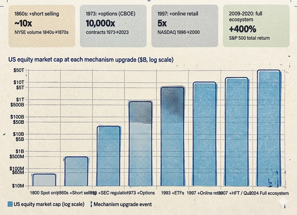 After short selling became widespread in the 1860s, NYSE volume grew 10x in a decade — Wall Street transformed from a small circle into a real capital market. After the 1938 uptick rule legitimized shorting, institutional capital poured in — the S&P 500 rose 340% over the following 30 years. After CBOE options launched in 1973, options volume grew 10,000x over 50 years — U.S. equities expanded for decades. After BTC perpetual contracts launched in 2019, BTC volatility dropped from 150% to 50%, yet market cap swelled from $10 billion to $2 trillion.