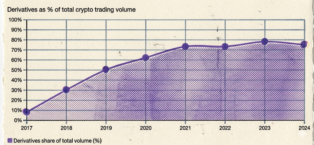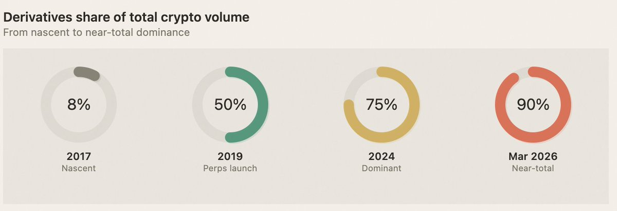 Data: BTC market cap went from $10 billion in 2016 to $2 trillion+ by 2024. Derivatives' share of total trading volume rose from under 10% in 2017 to approximately 90% by March 2026 — derivatives have completely taken over crypto's pricing power.