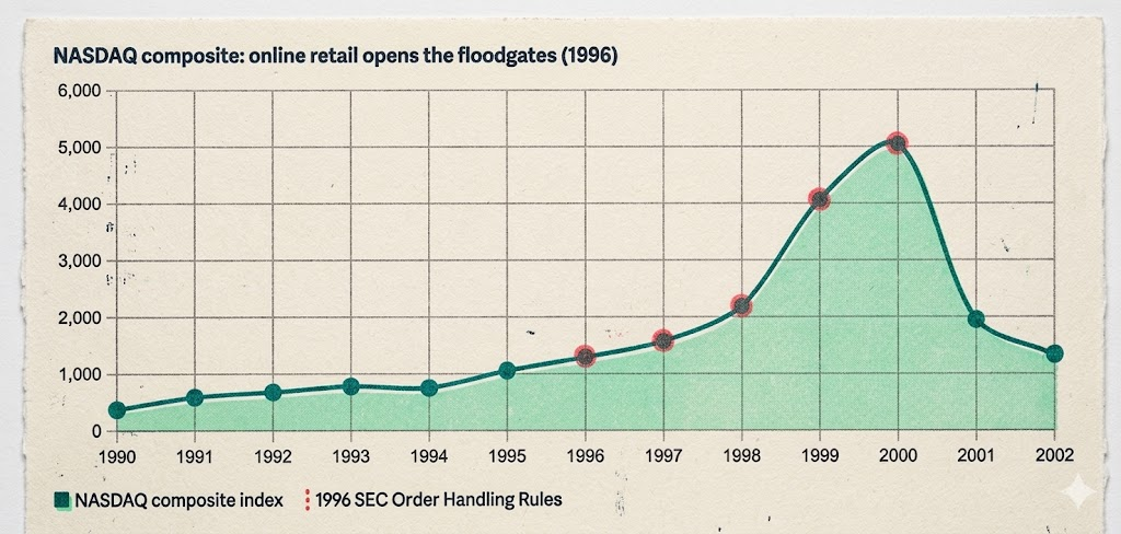 NASDAQ was already electronic — had been since 1971. The real unlock in 1996–1997 wasn't technology, it was access. SEC Order Handling Rules broke the market makers' pricing cartel. Online brokers nuked commissions from $50–100 to under $10. Suddenly anyone with an internet connection and a brokerage account was in the game.