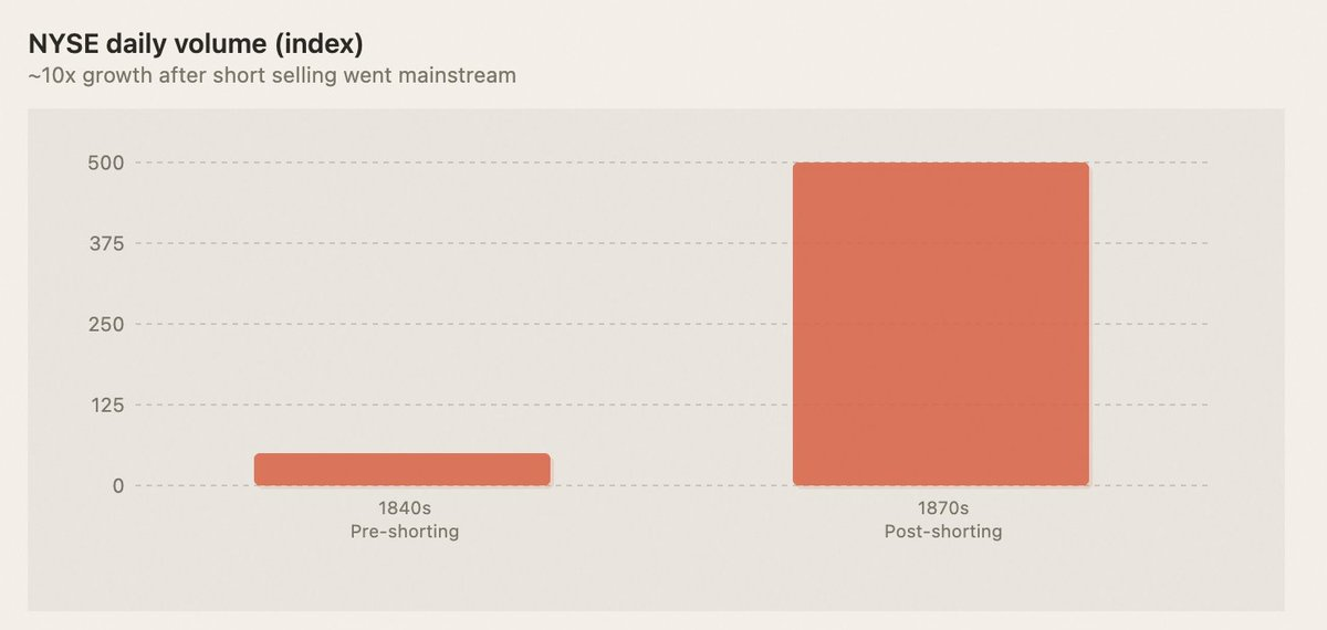 But the market's response was also the same as four hundred years prior: every short sale created a sell order and simultaneously created a future buy order that was guaranteed to come (short covering). Volume went up, spreads narrowed, more people were willing to enter. Wall Street transformed from a circle of a few dozen people into a real capital market.