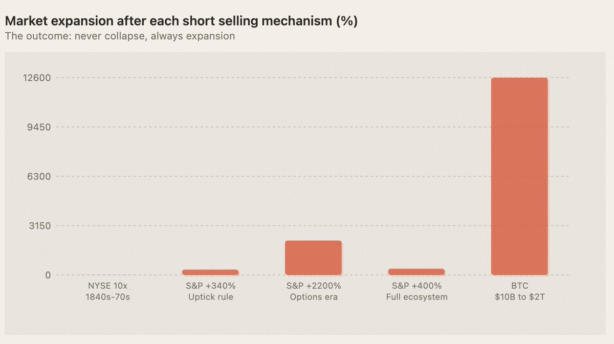 Shorts didn't kill BTC — that was the fear. What actually happened: a $10 billion speculative toy became a $2 trillion asset class. Turns out, the ability to bet against something is what makes it worth betting on.