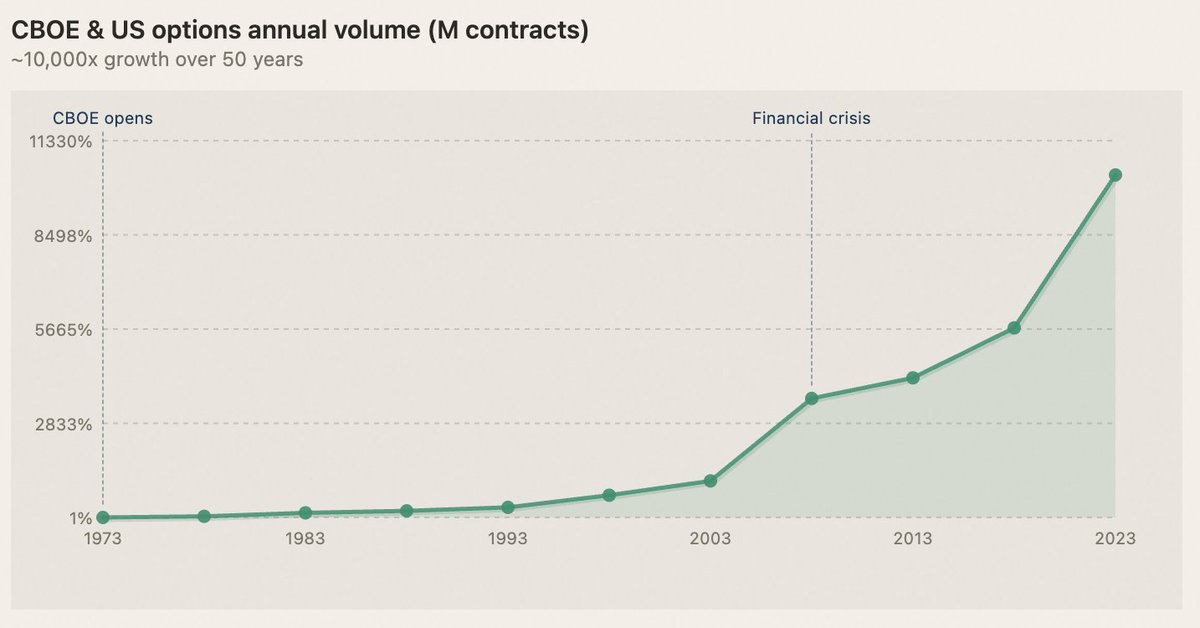 First year: 1.1 million contracts. A decade later: 100 million. By 2023: over 10 billion. Nearly 10,000x in half a century. Each jump unlocked a class of capital that had no way to play before.