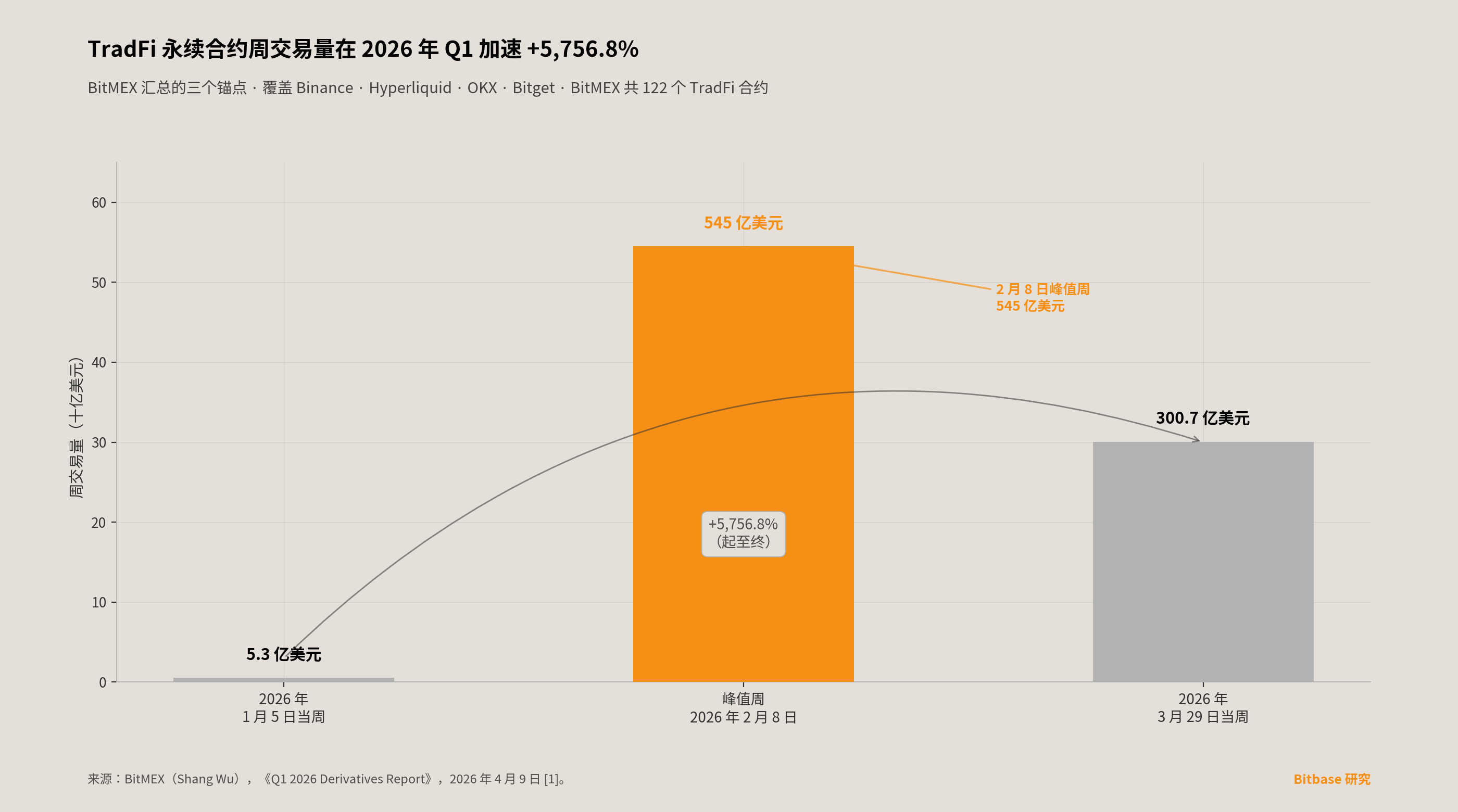 加密交易所向传统金融资产类别扩张的趋势,在 2025 年 10 月至 2026 年 4 月这六个月间实质性加速。BitMEX 于 2026 年 4 月 9 日发布的《2026 年 Q1 衍生品报告》——一份由 TradFi 永续合约市场参与方自行汇总的分析——指出:TradFi 永续合约(Perpetual Futures)的周交易量从 2026 年 Q1 初的 5.258 亿美元增长至 300.7 亿美元,报告计算的增幅达 +5,756.8%[1]。其中大宗商品子类别从每周 3,810 万美元增长至 250 亿美元(+65,463%),单周峰值出现在 2026 年 2 月 8 日的那一周,达 545 亿美元[1]。上述数字源自 BitMEX 对 Binance、Hyperliquid、OKX、Bitget 以及 BitMEX 自身 API 覆盖的 122 个 TradFi 永续合约的内部汇总;截至本报告发布日,Kaiko、CCData、Coin Metrics 或 Messari 均未发布独立复核的同类数据。