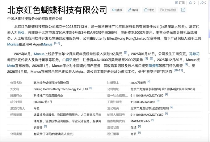 From a legal perspective, the answer seems clear – Manus has completed its relocation of its registration to Singapore, its holding structure is based in the Cayman Islands, and its parent company, Butterfly Effect Pte, is a Singaporean entity. This is also the core legal argument of the Manus team throughout the entire transaction: