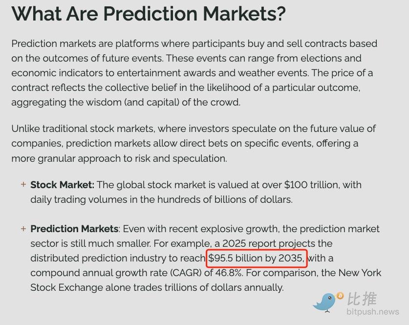 Compliant platforms are setting boundaries, experimental platforms are exploring possibilities, and the true winner may not emerge until after 2026. What is certain is that prediction markets are no longer just gambling, but are becoming a tool to help people understand uncertainty. A report by Certuity predicts that the prediction market could reach $95.5 billion by 2035, with a compound annual growth rate of 46.8%.