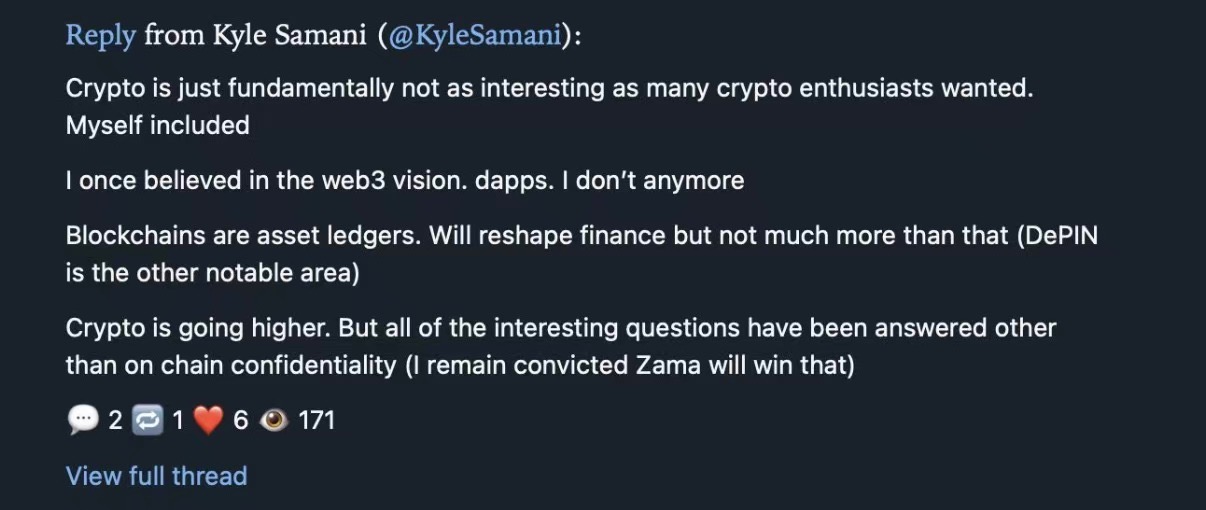 However, Kyle did not completely dismiss the idea. He remains optimistic about stablecoins, DeFi, RWA and other financial applications, as well as DePIN projects like Helium, and continues to bet on Zama's fully homomorphic encryption technology.