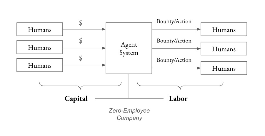 Marc Andreessen's famous quote, "The spread of computers and the internet will divide work into two categories: people who tell computers what to do, and people who are told what to do by computers," is more true today than ever before. I anticipate that in the rapidly evolving agent/human hierarchy, humans will play two distinct roles—labor contributors who perform small, bounty-based tasks on behalf of agents, and decentralized boards that provide strategic input to serve the agent's North Star.