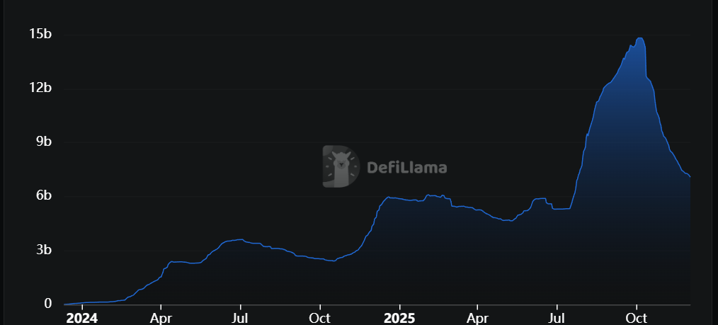 According to the latest data from DeFiLlama, as of December 2, 2025, USDe TVL has fallen to approximately $7 billion, a drop of more than 50% compared to its peak of over $14.8 billion in October.
