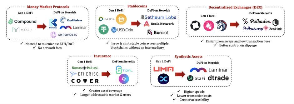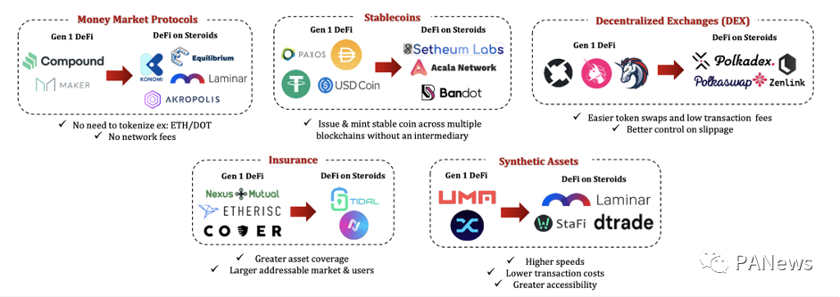 目前基于Substrate和跨链网关的DeFi创新中,已经有像Mangata这样的项目构建以太坊桥解决矿工抢跑问题,像Acala和Equilibrium,也在为Polkadot生态系统提供稳定币和货币市场协议支持,还有像Phala这样的隐私链下环境提供保密性基础。
