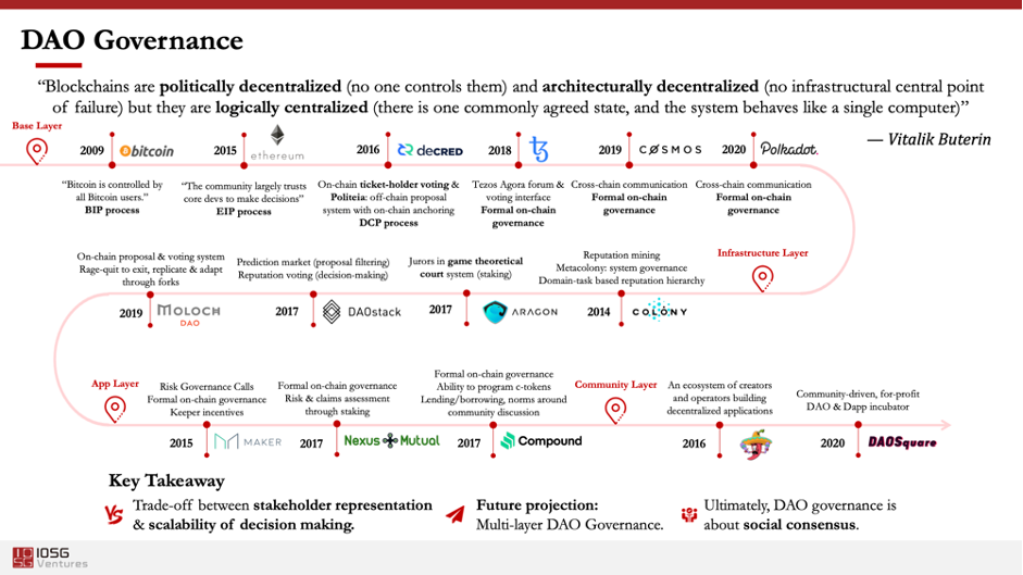 2020年,流动性挖矿成为了协议向核心用户分发代币的创新激励机制,类似 Aave 的“闪电贷”和“信用贷”等产品创新正在涌现。随着 DeFi 协议的发展,产生了越来越多具备治理价值的内核。以Maker和Compound为早期代表,2020年下半年至今,我们看到越来越多的DeFi项目开始了去中心化治理。项目使用开源代码程序进行决策,组织的财务记录会保存在区块链上。去中心化自治组织及治理方式对当今世界许多传统的等级制度和排他性组织结构来说无疑是一个巨大的挑战。它通过 '群体智慧'进行更好的集体决策,这在治理民主化方面相较于传统治理模式更为优越。DAO可以最大限度地使利益相关者参与到决策流程(权利下放),并实现治理透明化。在没有权利下放的情况下,DeFi工具可能不会具有革命性。只有权利下放,DeFi平台和项目才能实现革命性结果。
