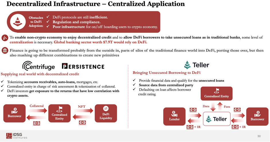 全球未被满足的金融需求意味着5.2万亿美元的市场机会。IOSG投资的Centrifuge和Persistence是瞄准这些赚钱机会的佼佼者。这类DeFi的主要目标是让全球用户参与到去中心化经济当中来,并且能够即时获利。Centrifuge、Persistence和 Goldfinch连接金融科技公司,他们从DeFi聚集资本,向需要的人发放贷款。从长远来看,这是最让我们兴奋的方向之一,因为它展现了技术和自由流动资本能为普通人创造的有形价值的力量。