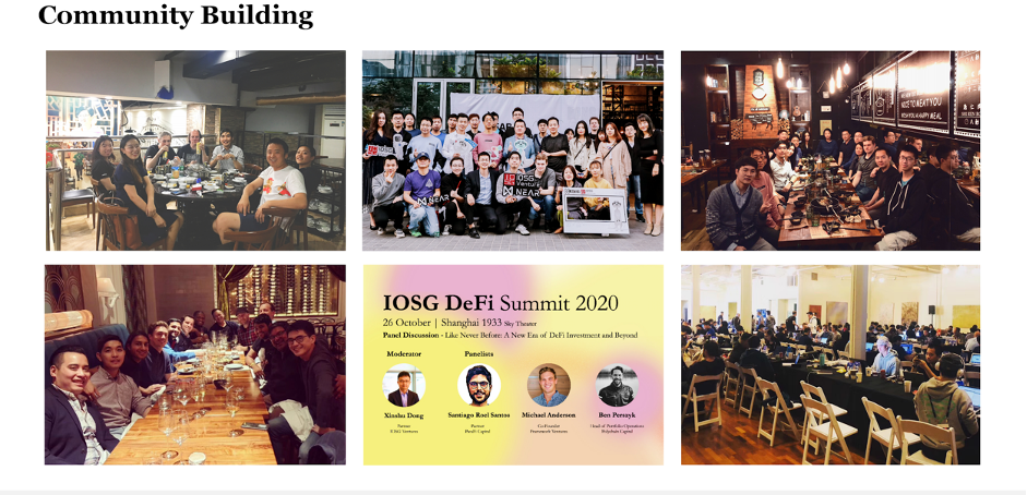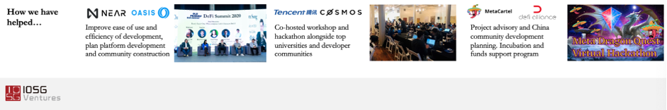 IOSG Ventures 加入行业内相关知名组织,比如以太坊企业联盟(Enterprise Ethereum Alliance,EEA )、芝加哥DeFi联盟(Chicago DeFi Alliance,CDA)等,为portfolio制定创企业成长计划,帮助他们走的更远。同时IOSG也是DeFi知名活动DeFi Summit的主要参与者和推动者,也同时是Metacartel DAO的正式成员。我们坚信社区的力量,坚持作为投资机构帮助初创企业成长的责任,我们希望给予的不仅是金钱上的帮助,还有社区及资源支持。我们时常与各项目创始人、团队、开发者、交易所、学术研究机构、其他风投基金、媒体和网络意见领袖等保持紧密联系,帮助如Near和Oasis等项目建立合作,提升其产品的易用性和开发效率,并协助建立社区;同时我们也在鼓励更多开发者参与到整个行业中,为赞助腾讯和Cosmos联合顶级大学和开发者社区共同举办的研讨会和一些黑客松活动提供赞助。
