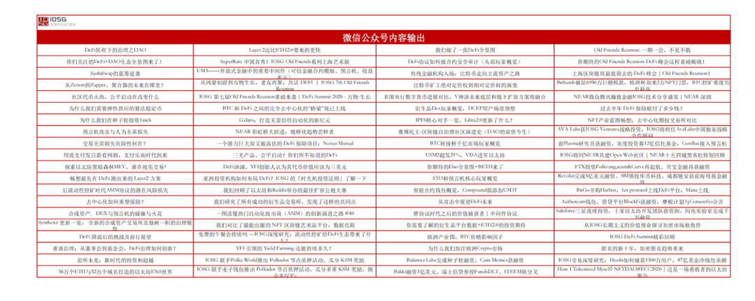 活动是帮助项目曝光以及获取资源的绝佳方式,在过去一年中,IOSG Ventures最为亮眼的活动当属我们的第七届 Old Friends Reunion IOSG DeFi Summit。2020年10月26日,Old Friends Reunion 在上海1933老场坊圆满落下帷幕。IOSG Ventures携手 imToken、DeBank 以及 Aave 共同打造了一场空前的思想交流盛宴。