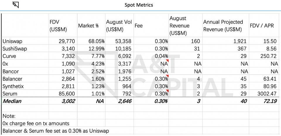 我分析了当前现货 DEX 的指标,并为进一步估值预测原创了一个有用的系数:「FDV / APR」(完全稀释的估值 / 年化预计收入)。