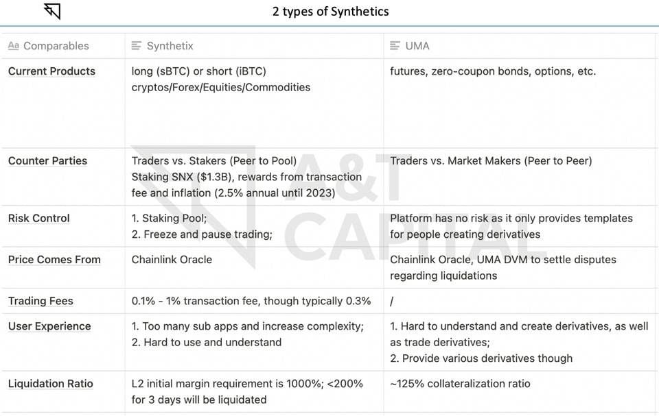 Synthetics US$9.4B [Synthetix: US$9.4B fromstats.synthetix.io; UMA: no transaction data, TVL is US$144M fromprojects.umaproject; Mirror Finance: ~US$13.9M from the most traded assets onmirror.finance;]