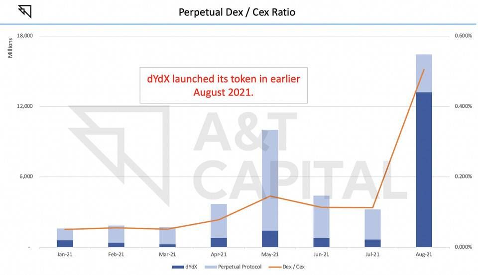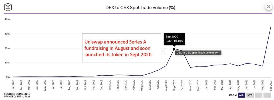 我个人相信,龙头项目发行平台代币,对整个行业的拉动作用非常大。下图展示了衍生品龙头 dYdX 和现货龙头 Uniswap 的平台代币发行前后对中心化交易所的影响。可以看出,UNI 发行后,现货 DEX/CEX 比率跃升至 20%,之后再也没有回到 2020 年 8 月之前的水平(当时上轮融资前后传出代币发行的传闻)。