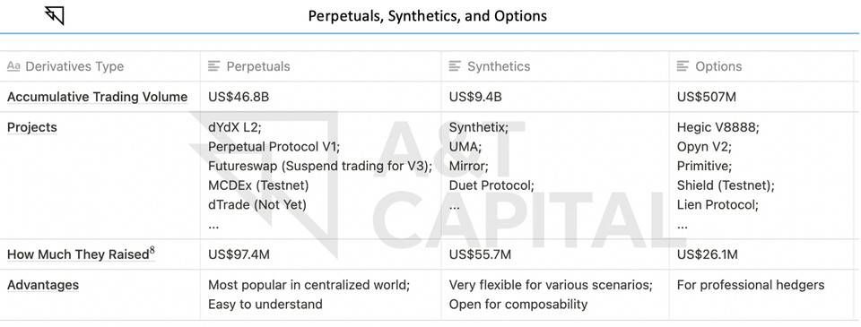 Perpetuals US$97.4M [dYdX: US$87M; Perpetual Protocol: US$1.8M; Futureswap: US$1.6M; MCDEx: US$7M; from multi-sources including Crunchbase.]