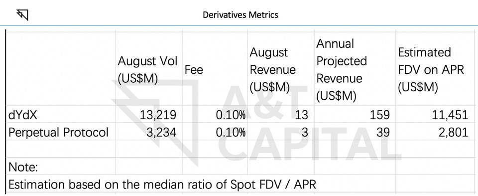 将现货 DEX 的 FDV / APR 中值分别乘以衍生品 APR,我估算出的值是: dYdX 的 FDV 约为 114.51 亿美元,而 Perpetual Protocol 的 FDV 约为 28.01 亿美元。