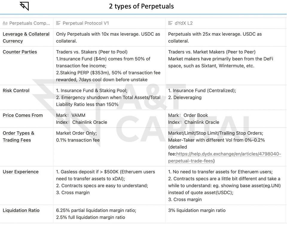 我个人认为,「点对池」的 Perpetual 是 Synthetix 的改进版本。有 3 个原因:a) 当您可以轻松地从 Perpetuals 获得加密货币风险敞口时,何必还要使用更复杂的系统; b) 目前,Synthetix 上近 90%9合成资产的底层资产是加密合成代币,这意味着对现实世界资产的需求并不成熟。 此外,永续合约也适用于现实世界的资产衍生品; c) 很好地采用了保证金机制,它显示出比抵押更高的资本效率,例如 Synthetix 的清算率为 200% ,而 Perpetual Protocol 的清算率则是 2.5%。