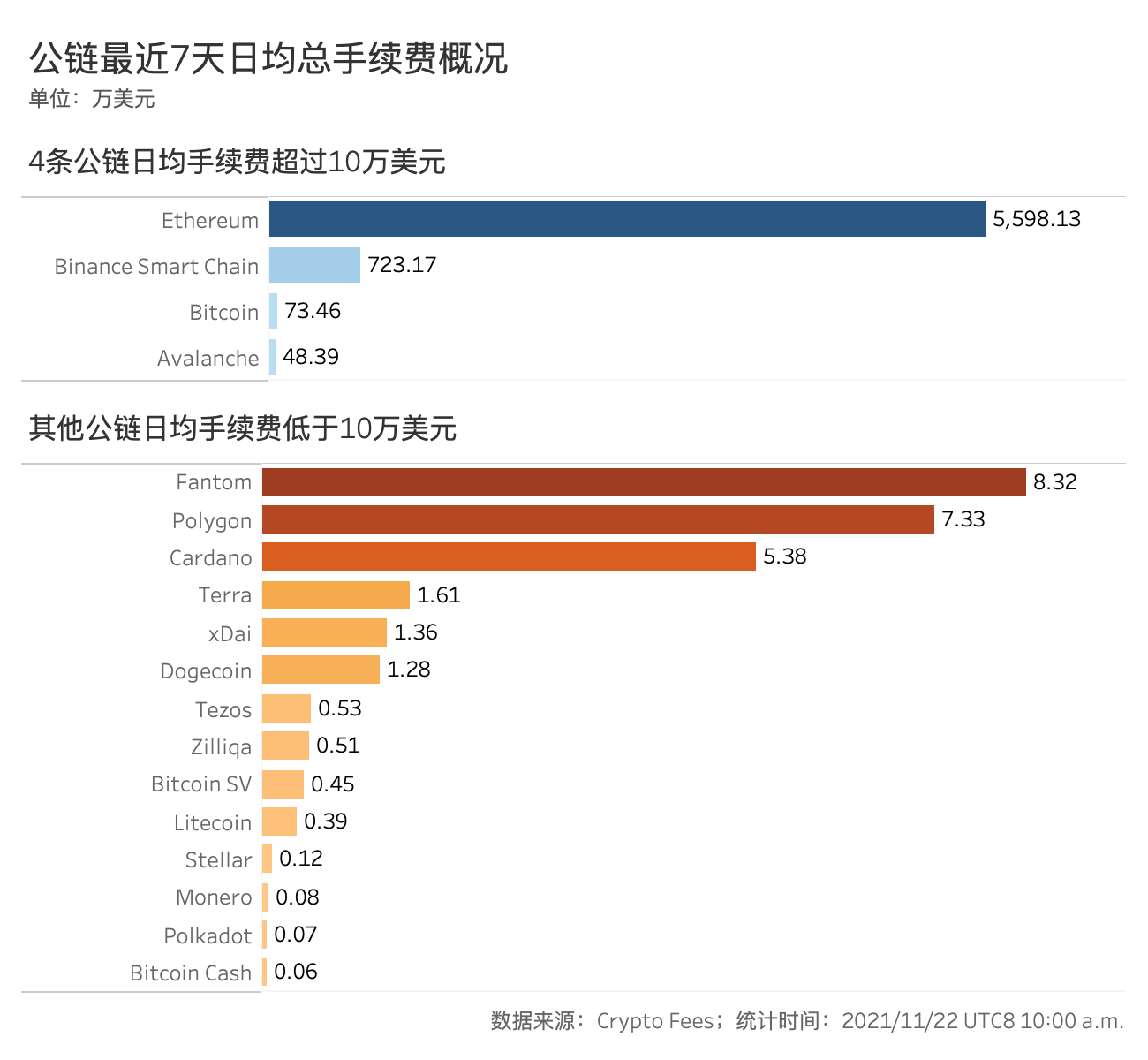 根据CryptoFees的统计,截至11月22日上午10点,18条公链的日均手续费(MA7)已累计超过6470万美元。其中,86%的手续费来自Ethereum,达到了5598万美元,远远超过其他公链。不过,BinanceSmartChain(BSC)的日均手续费(MA7)也已经超过了723万美元,是仅次于Ethereum手续费最高的公链。除此之外地,Bitcoin和Avalanche的日均手续费及也在10万美元以上,分别约为73.46万美元和48.39万美元。而其他14条公链的日均手续费都不足10万美元,规模较小。