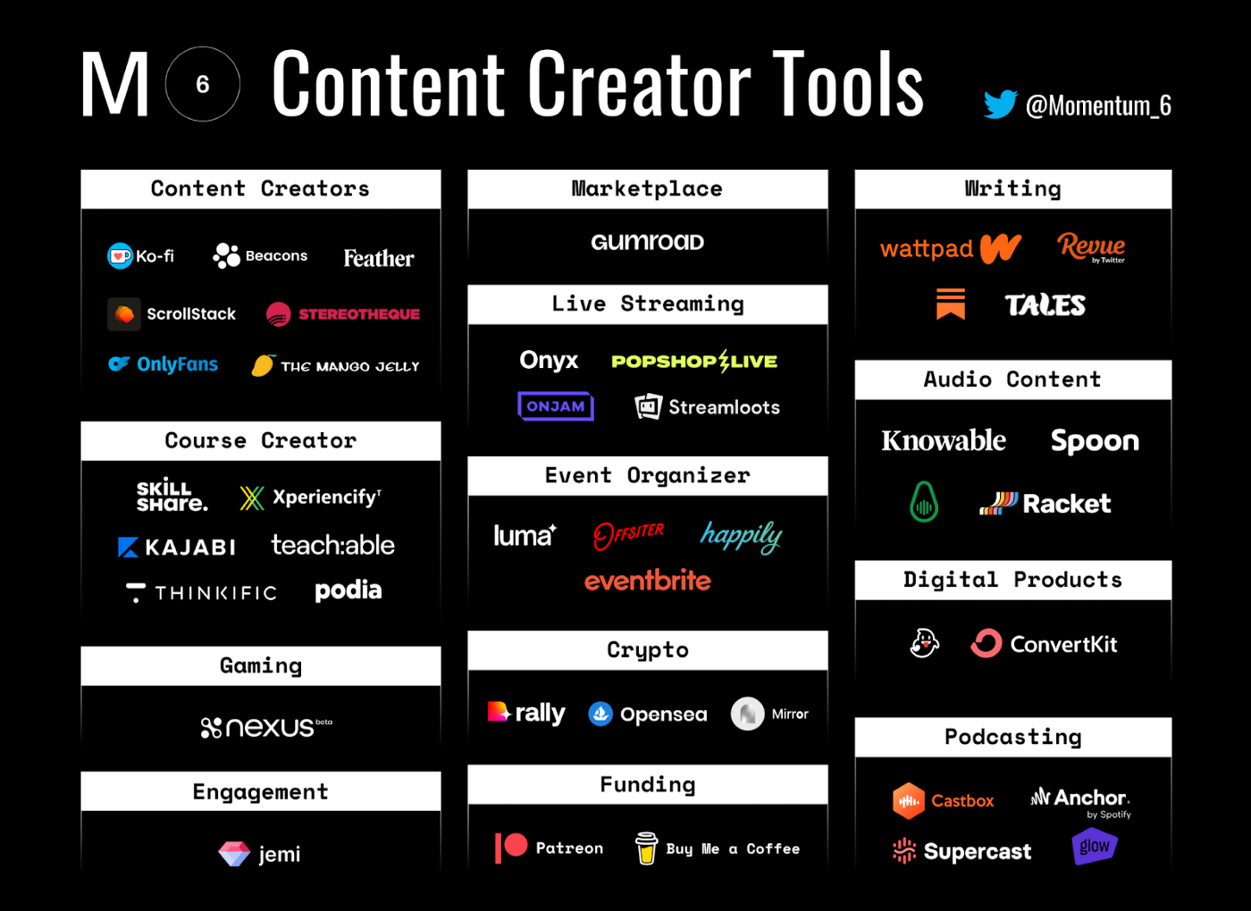 我们可能会看到更多为创作者量身定做的解决方案。尽管每年有数十亿美元涌入创作者经济,但由于许多业余爱好者正在寻找营销渠道,它还没有过度饱和。我们需要看到为不同的商业需求定制的产品,如营销、运营、投资、版权专业知识、产品发布,甚至是社区建设。发现这些需求并创造解决这些需求的工具的公司将成为最终的赢家。