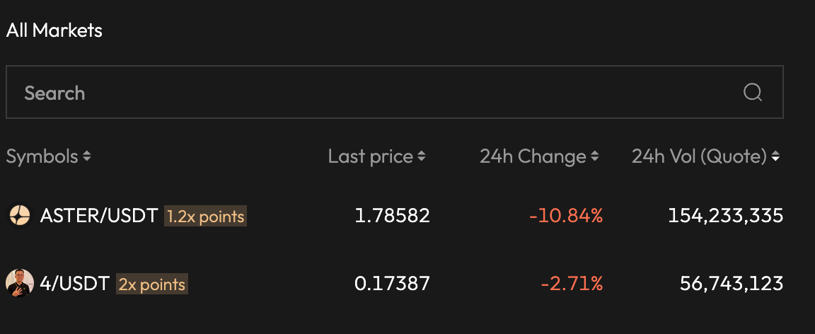 PANews reported on October 9th that the latest data from Aster DEX shows that the 24-hour trading volume of the $4/USDT spot trading pair on the Aster DEX platform reached $56.74 million, ranking second only to $ASTER/USDT's $154 million. Despite a 2.71% price drop of $4/USDT, trading volume continued to increase, demonstrating user confidence in Aster DEX's deep liquidity and trading experience.