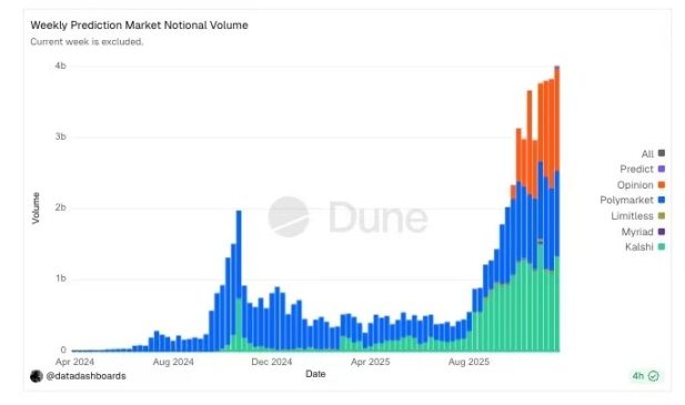 As the chart shows, weekly trading volume in the prediction market has recently experienced an unprecedented exponential surge, peaking at over $4 billion.