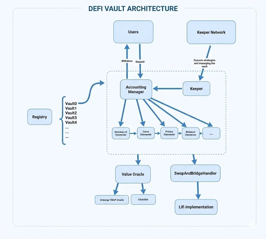 The technical architecture of NOYA Vault is as follows: each vault is uniformly registered and managed through the Registry ; the AccountingManager is responsible for user share (ERC-20) and net asset value pricing; the underlying layer connects to protocols such as Aave and Uniswap through modular Connectors and calculates cross-protocol TVL, relying on the Value Oracle (Chainlink + Uniswap v3 TWAP) to complete price routing and valuation; transactions and cross-chain operations are executed by the Swap Handler (LiFi) ; finally, strategy execution is triggered by Keeper multi-signature , forming a composable and auditable execution closed loop.