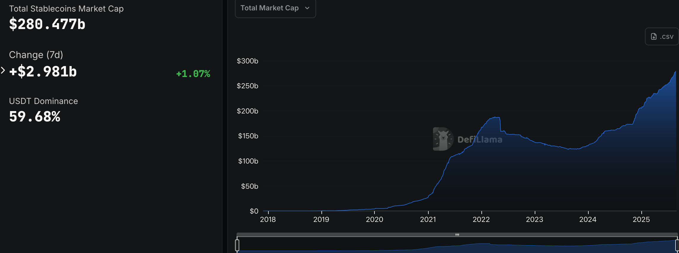 The total market capitalization of stablecoins has exceeded $280 billion, a new high, with USDT accounting for nearly 60%